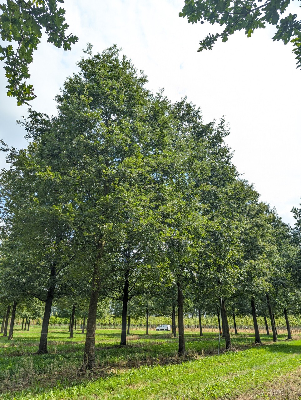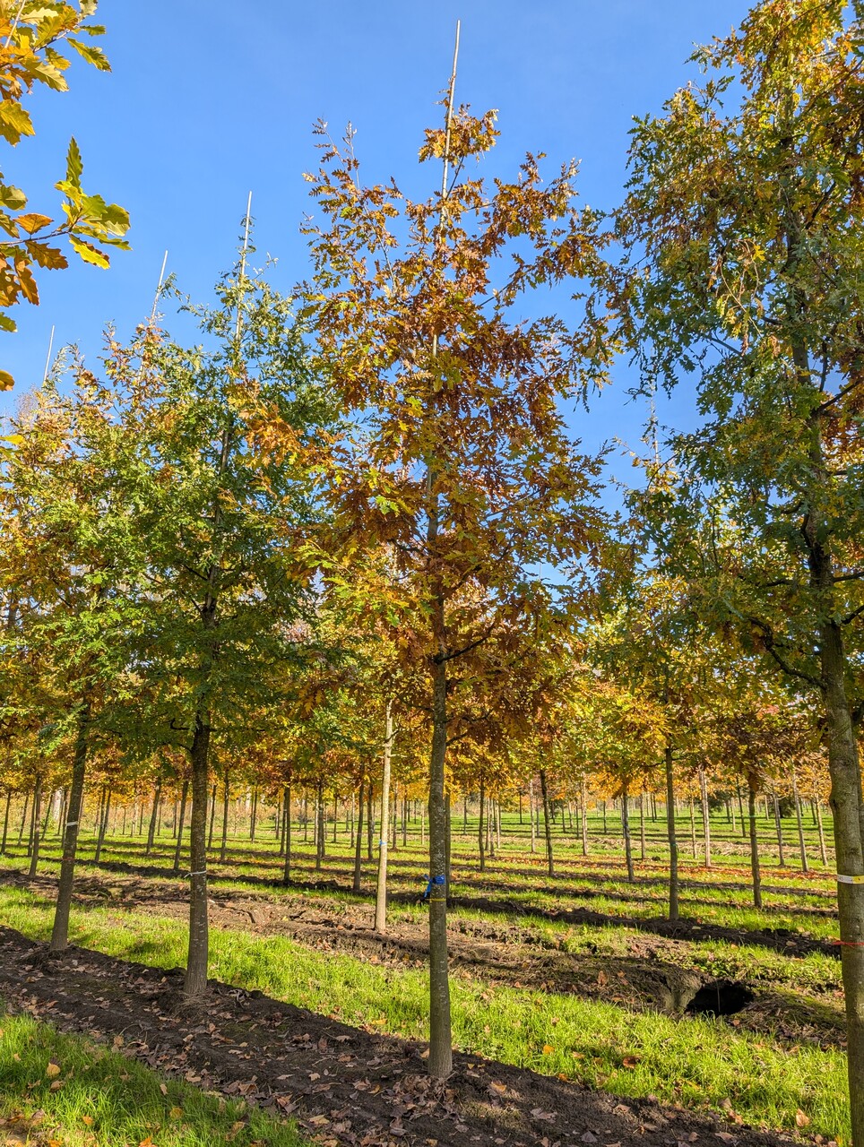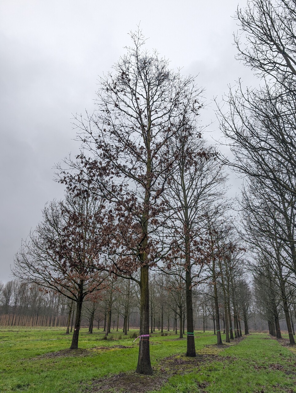 A sturdy tree with a broad, spherical, later rounded crown usually with an ascending main trunk with heavy crown branches. The trunk is roughly grooved with long bark plates. Young twigs are greyish and felt-like, angular at the top. The buds have downy hairs and moss-like stipules. The dark green leathery leaves vary in shape, usually elongated to oval. They are rough on the upper side, bare on the underside, and have 4 to 9 pairs of shallow to very deep lobes. The autumn colour is yellowish-brown. The leaves remain on the tree until deep into the winter. The acorns are half enclosed in the cupule that is thickly covered with narrow scales; these are turned backwards at the top and have thick grey hairs. The tree is an important producer of timber. It is sensitive to cracks caused by frost but insensitive to mildew.