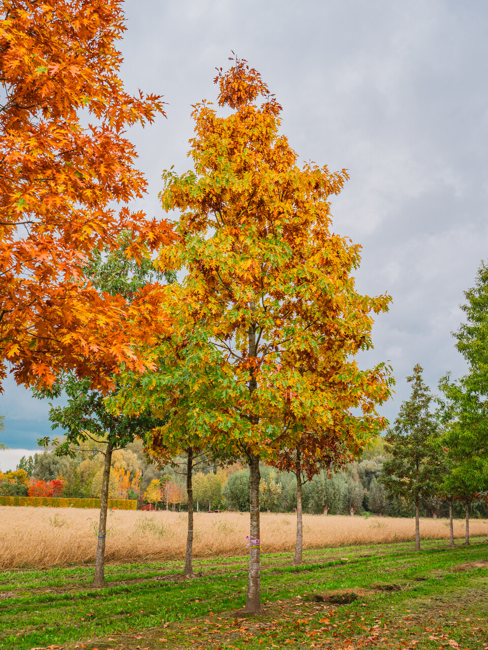 Listy stromu Quercus rubra sa na jeseň sfarbia do oranžová, červená."