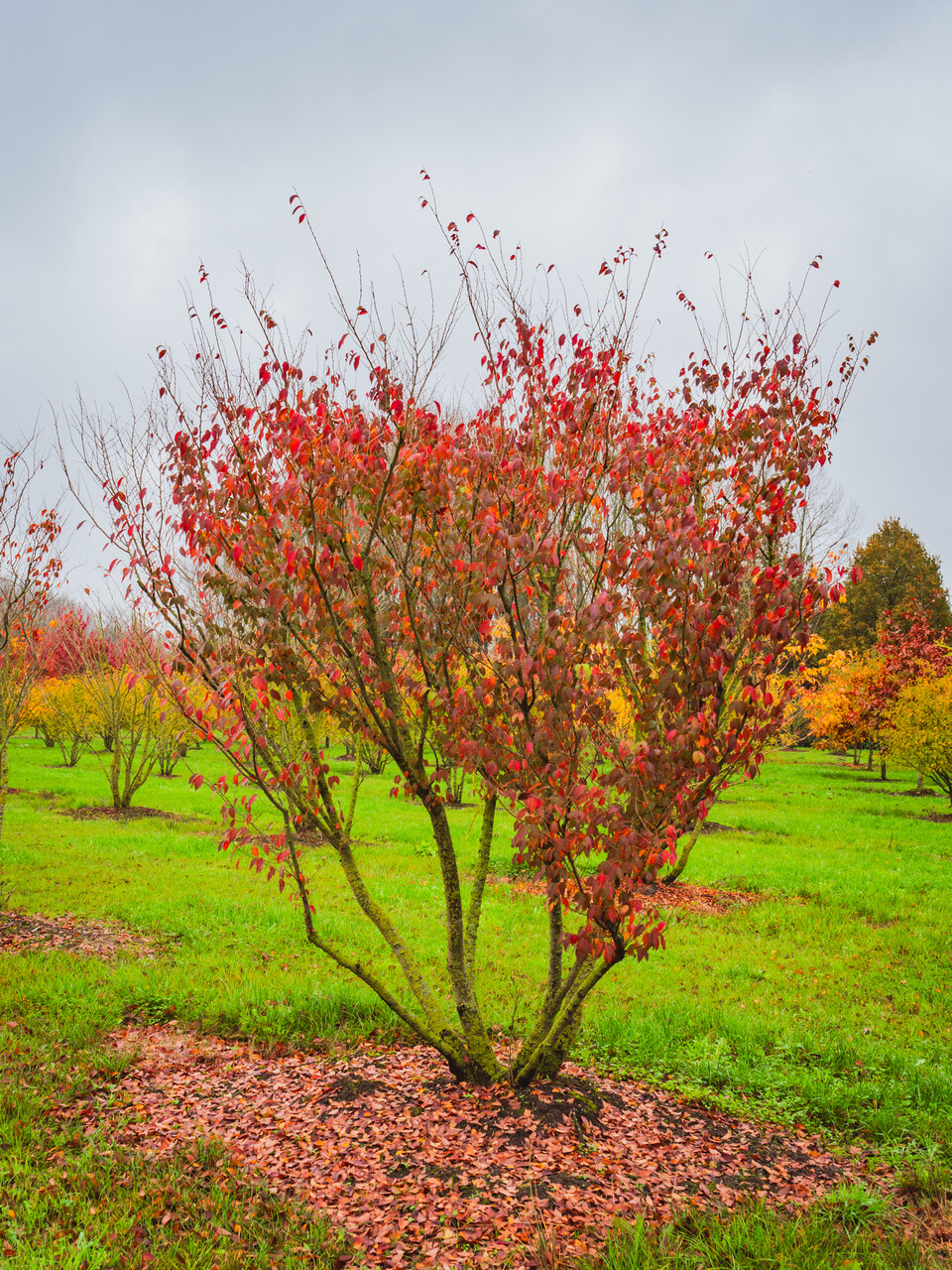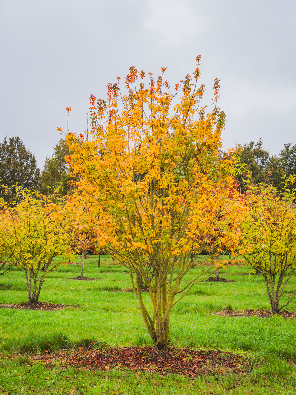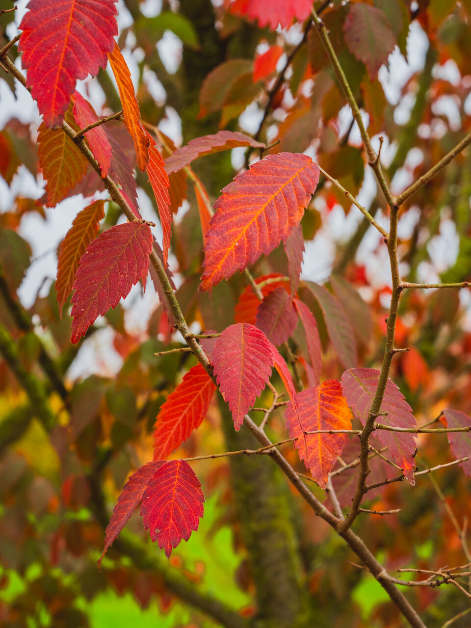 Listy stromu Zelkova serrata sa na jeseň sfarbia do žltá, oranžová, červená."