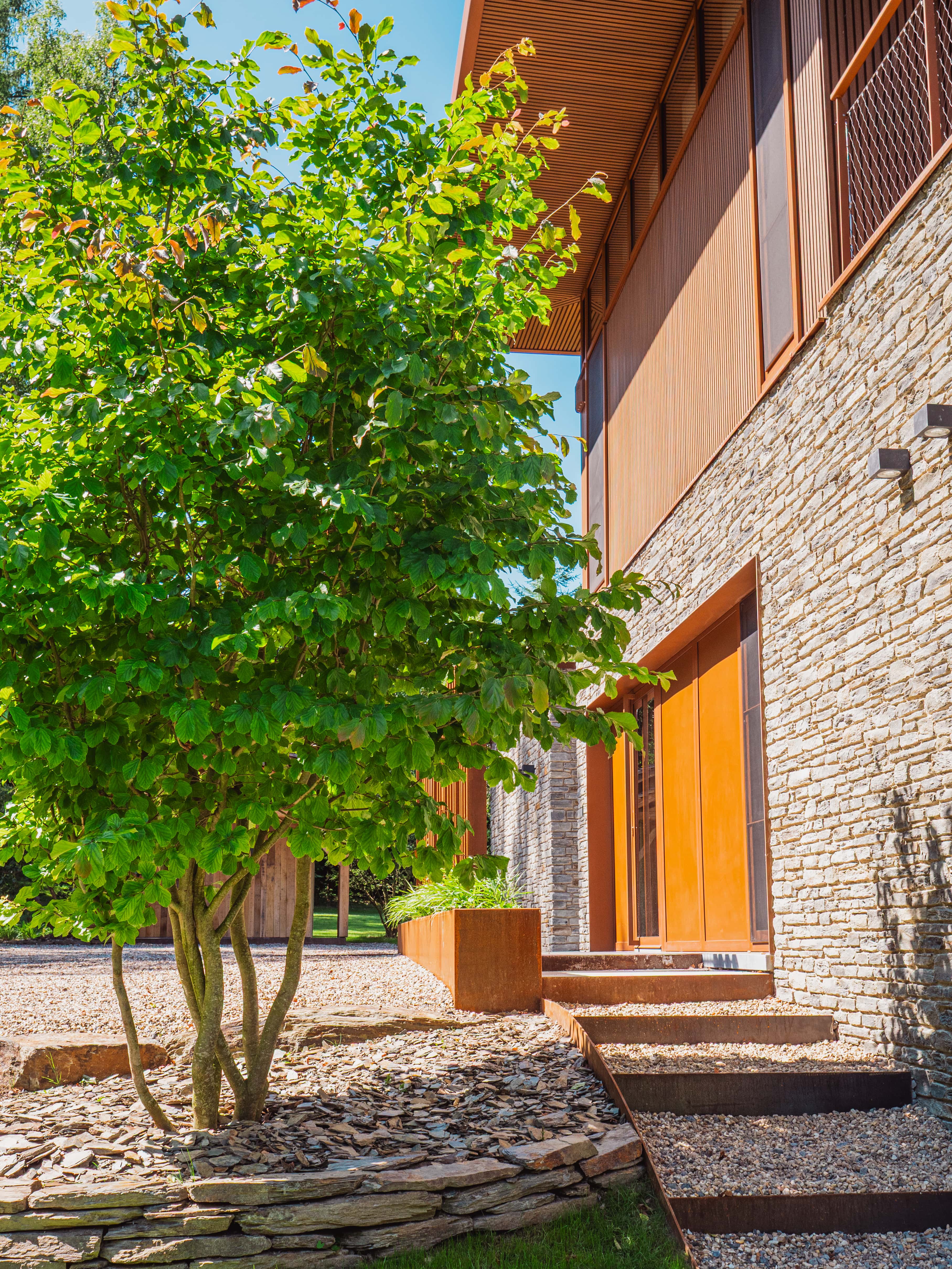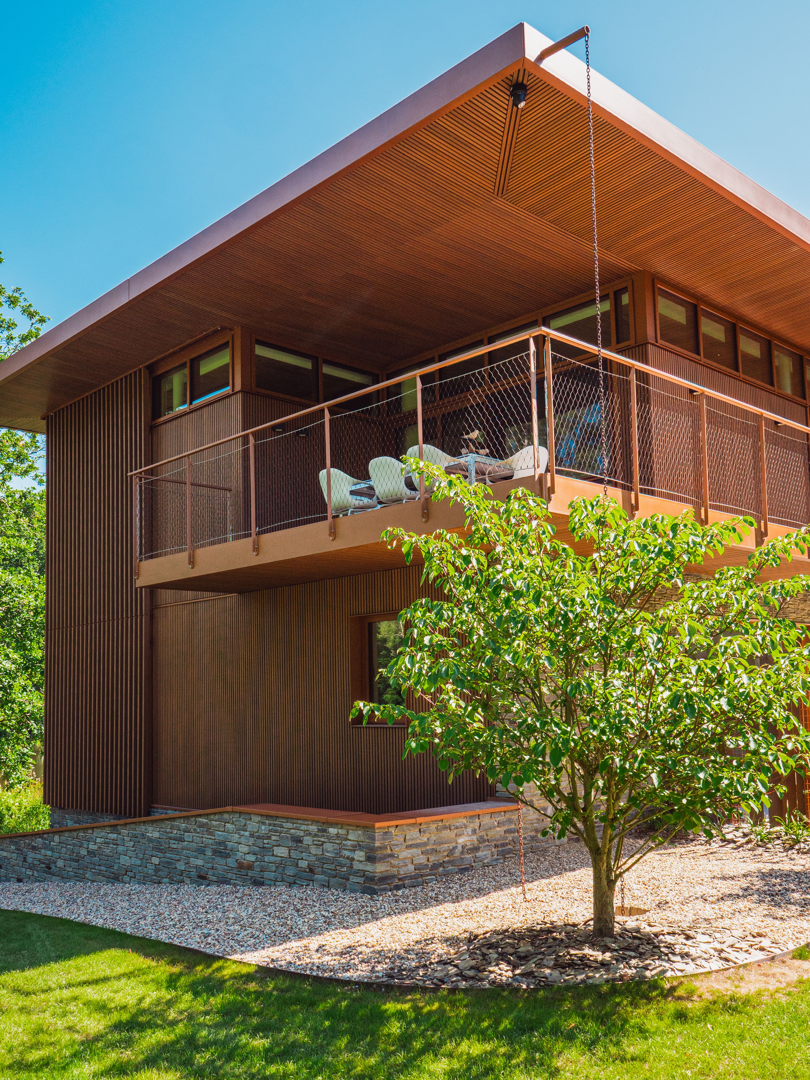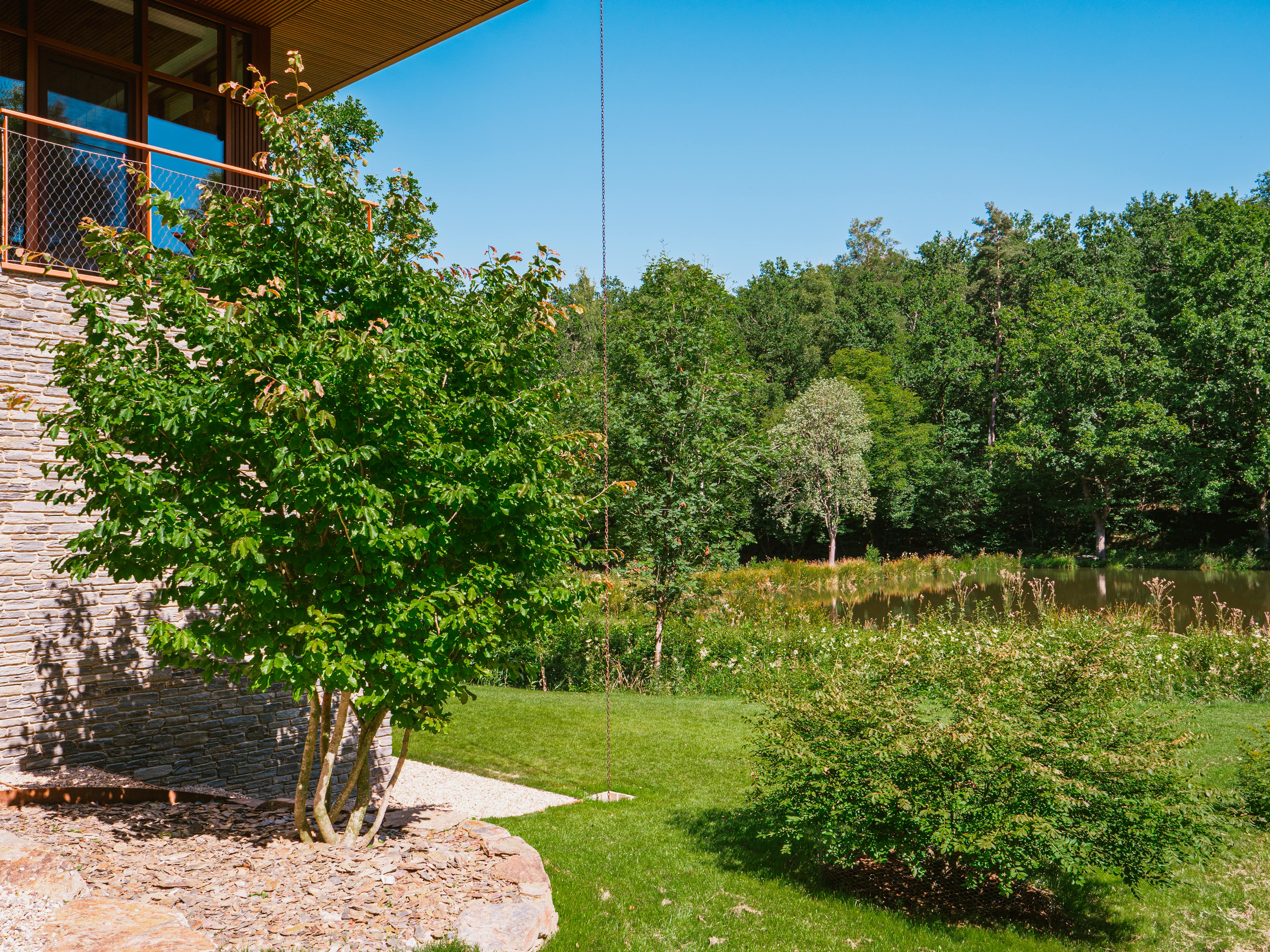 Okolo modernej rezidencie, ktorá je navrhnutá v očarujúcom retro štýle, bolo vysadených množstvo stromov. Tieto zelené výsadby zabezpečujú, že záhrada plynulo prechádza do okolitej krajiny a v každom ročnom období ponúka iný atmosférický scenár. Celok tvorí nádherný obraz, z ktorého sa obyvatelia budú tešiť ešte mnoho rokov.