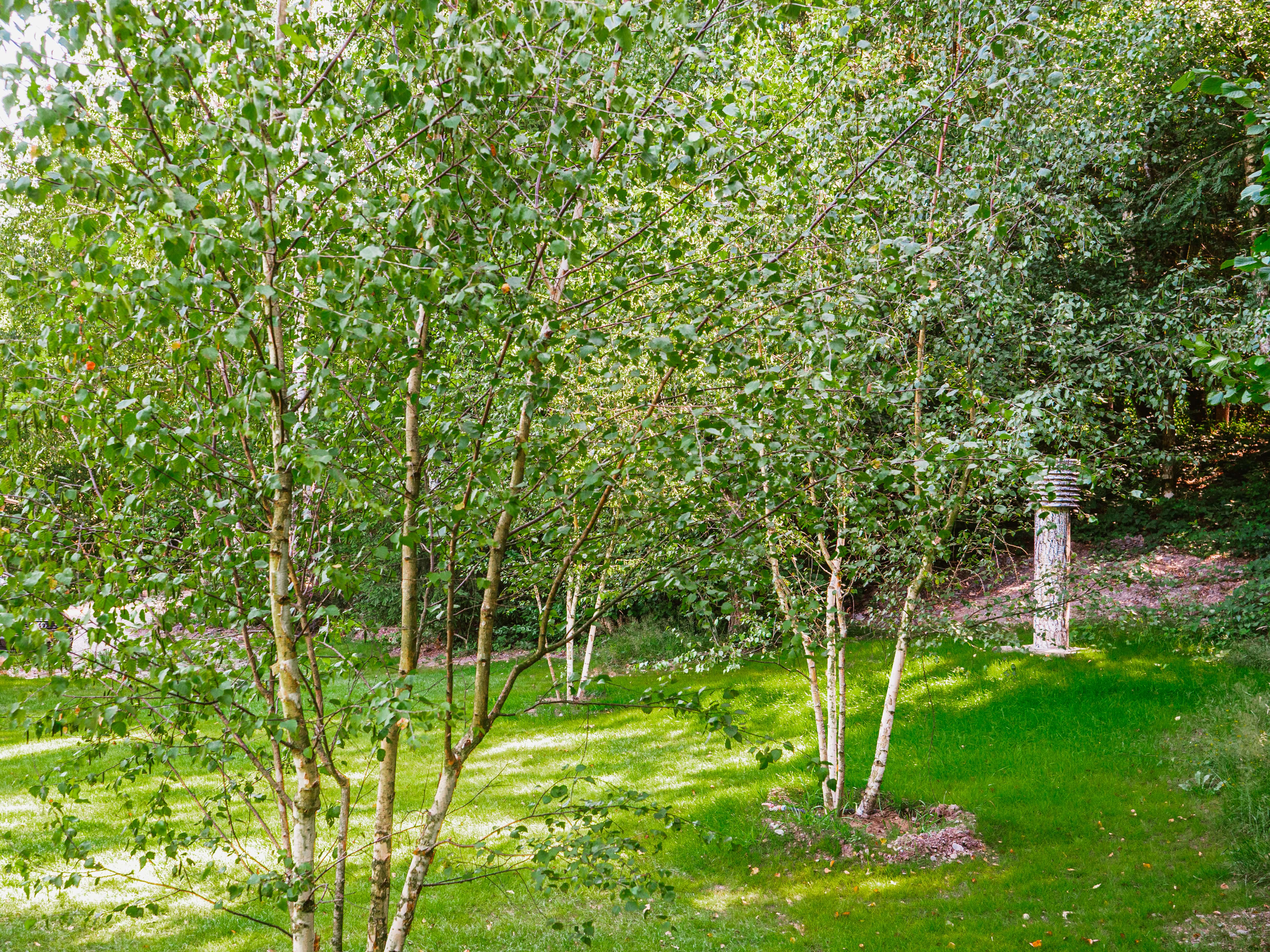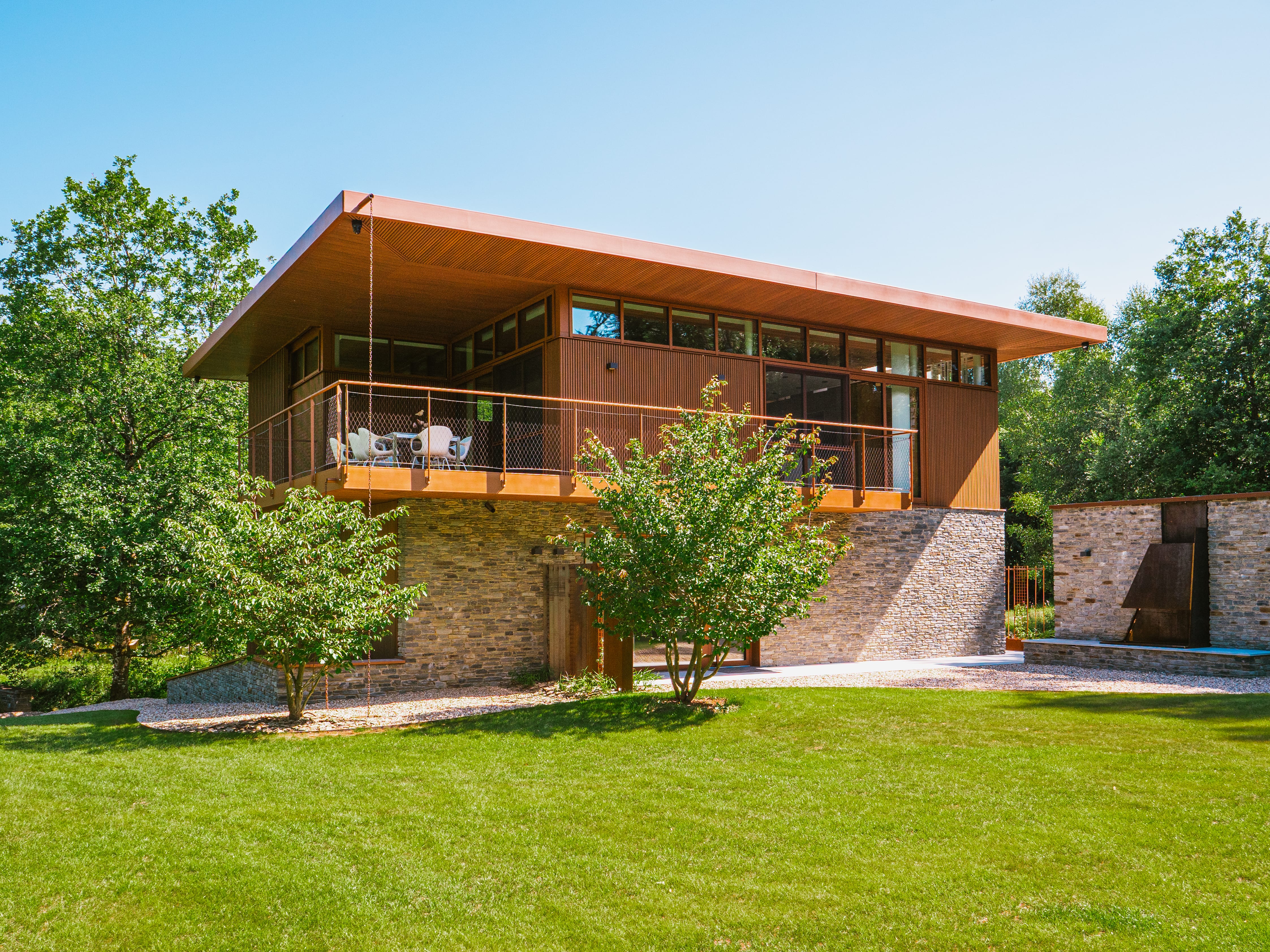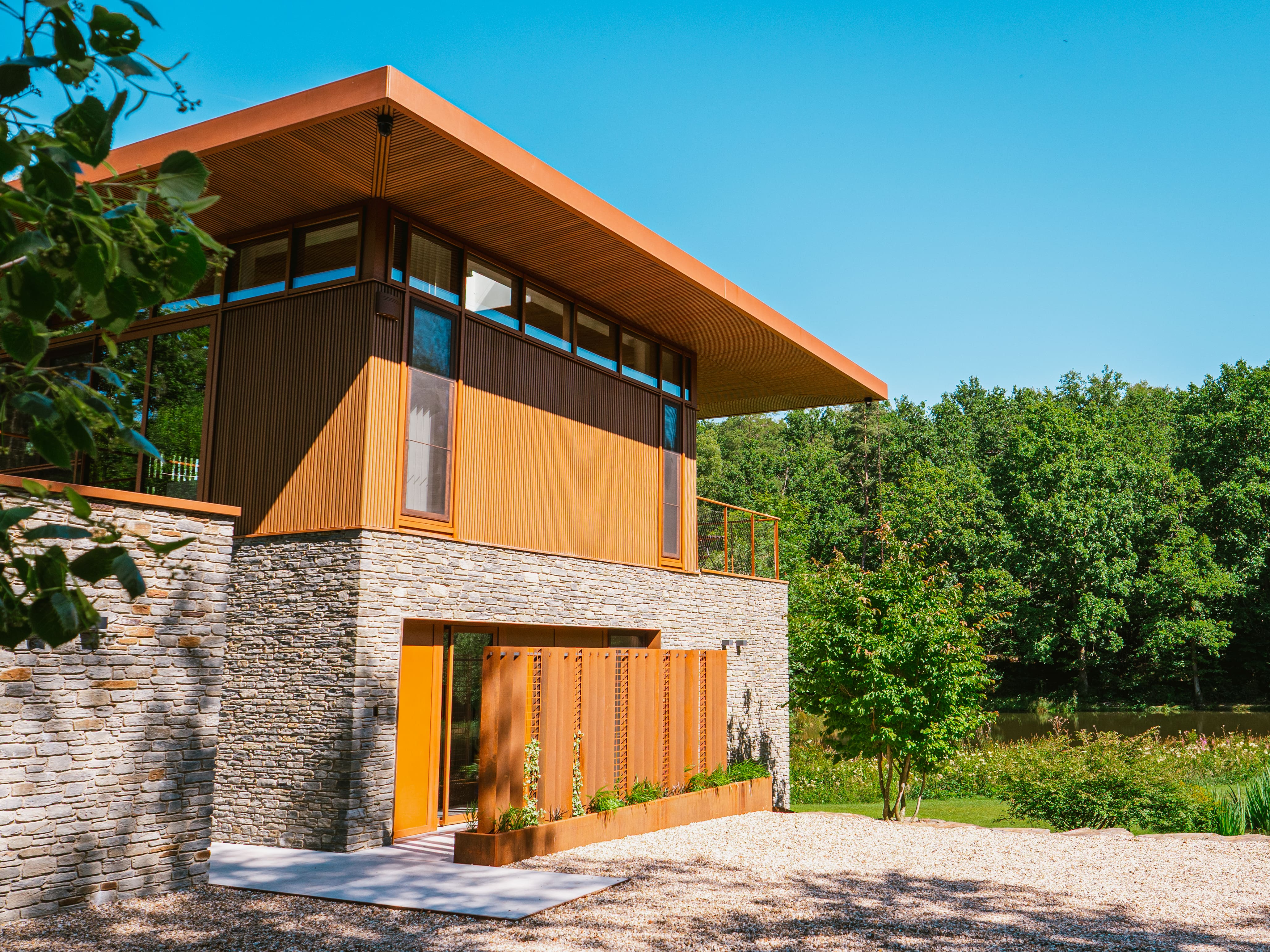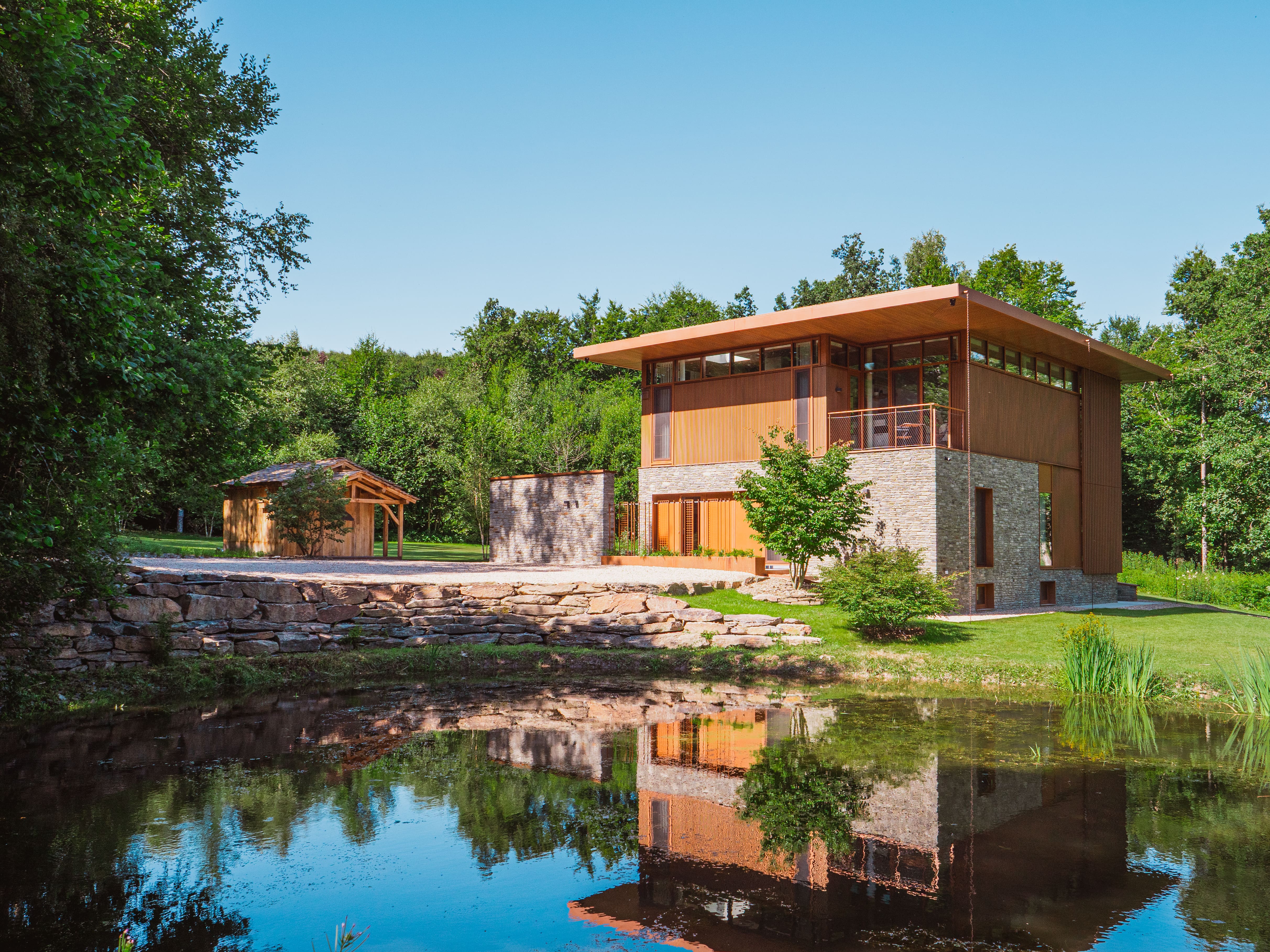 Okolo modernej rezidencie, ktorá je navrhnutá v očarujúcom retro štýle, bolo vysadených množstvo stromov. Tieto zelené výsadby zabezpečujú, že záhrada plynulo prechádza do okolitej krajiny a v každom ročnom období ponúka iný atmosférický scenár. Celok tvorí nádherný obraz, z ktorého sa obyvatelia budú tešiť ešte mnoho rokov.