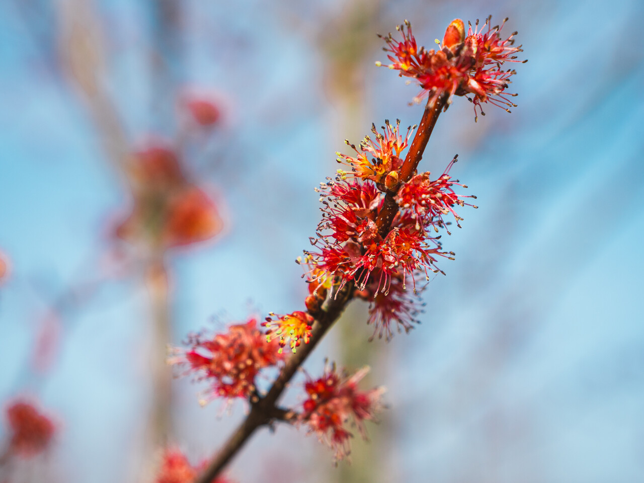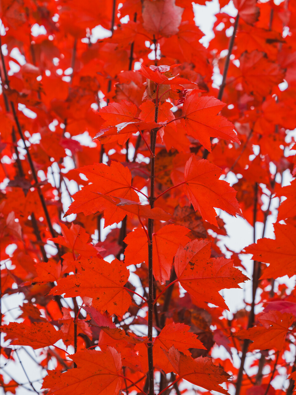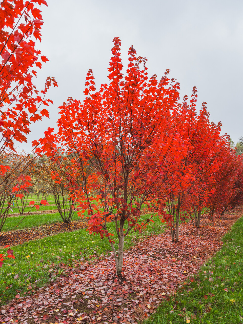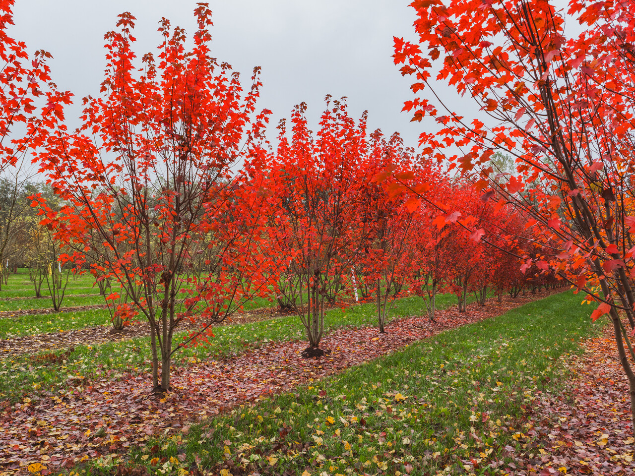 Listy stromu Acer rubrum 'Brandywine' sa na jeseň sfarbia do červená, fialová."