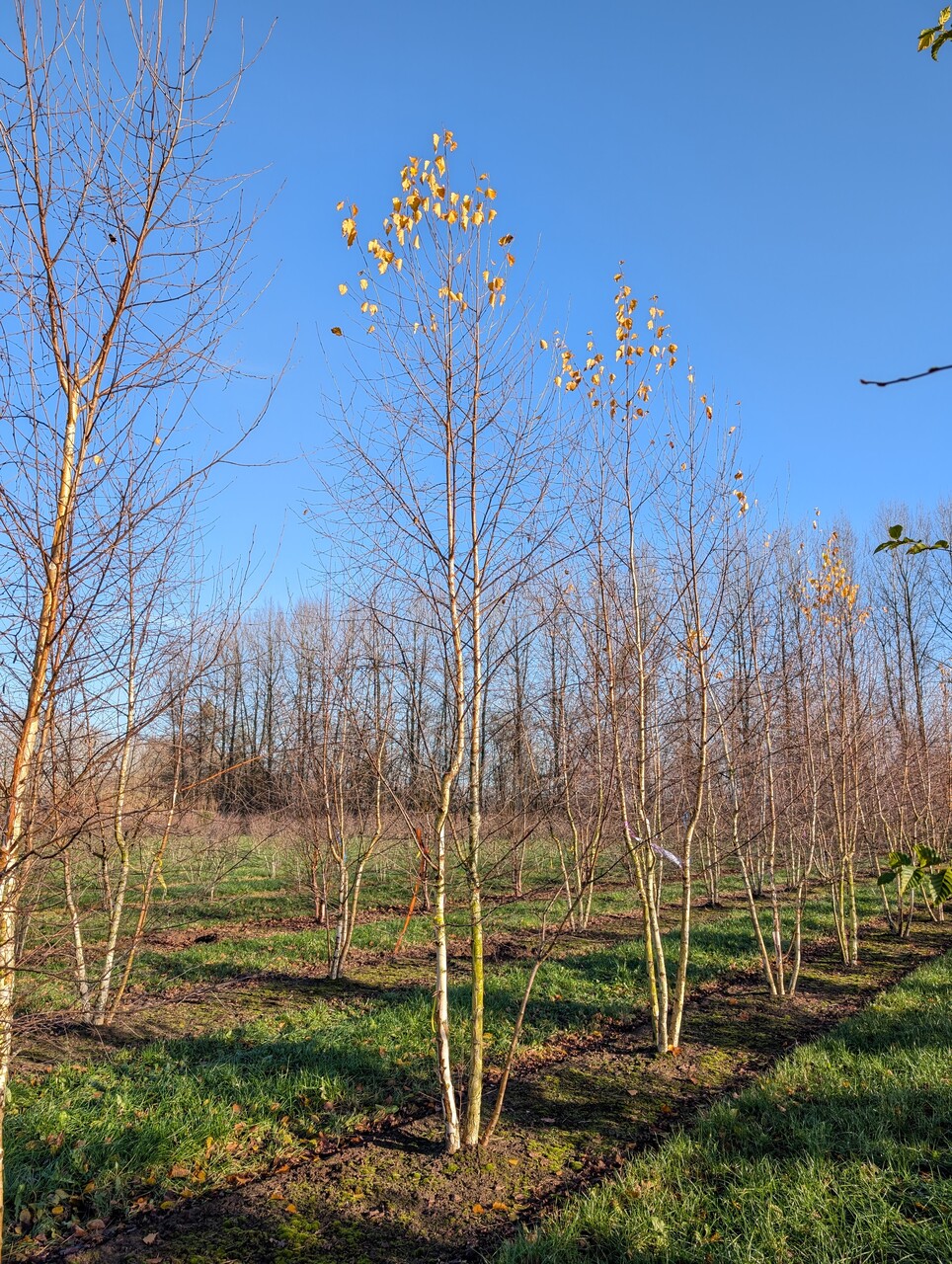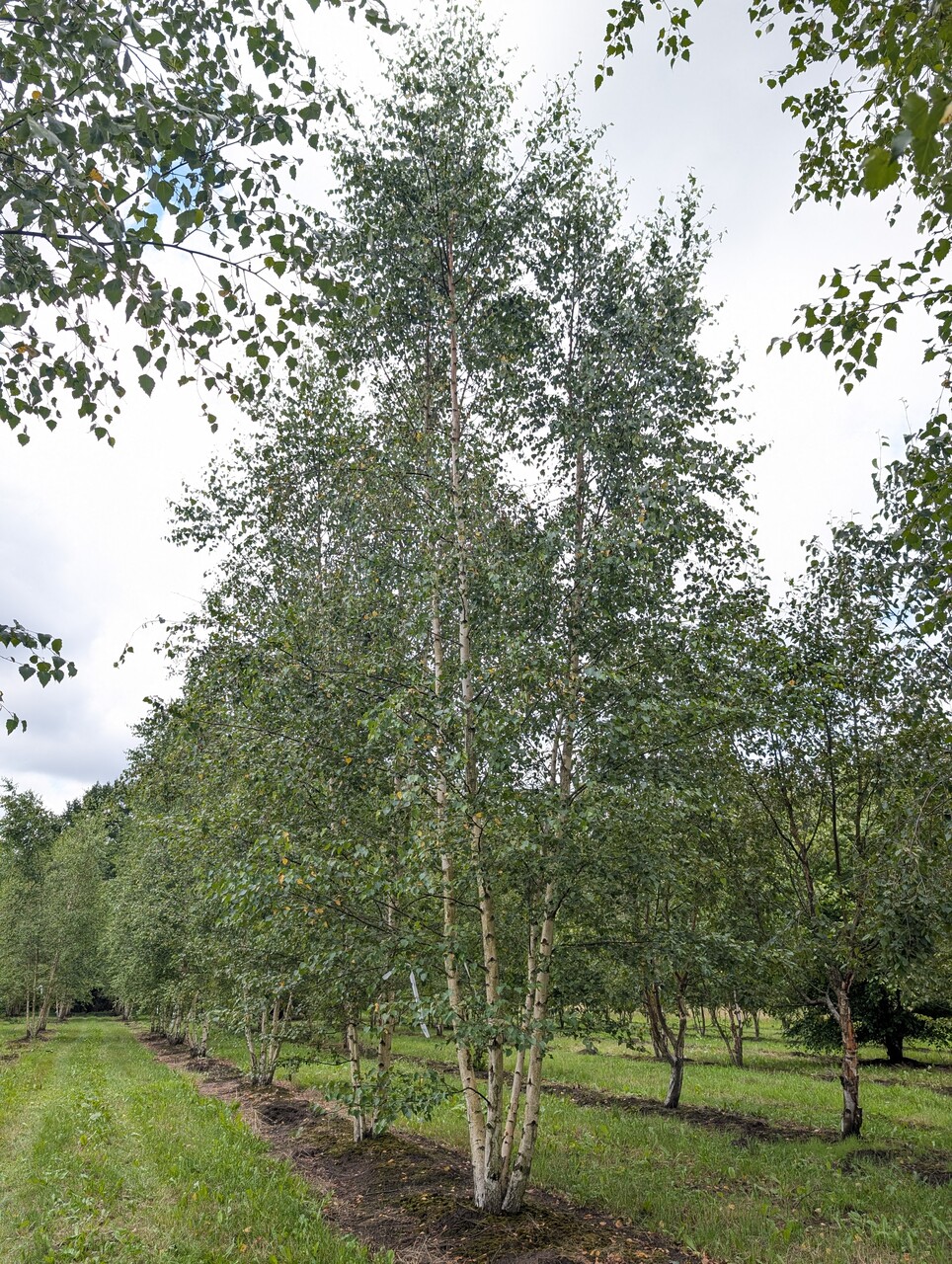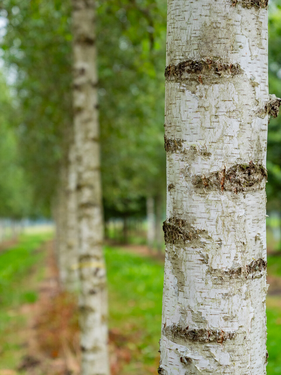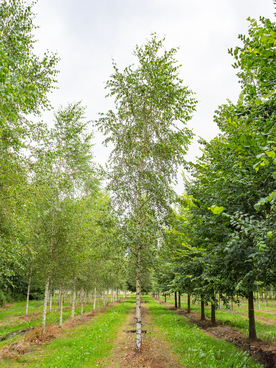 Native to almost entire Europe, where it is used as an important timber producer. In nature specimen of 30 m high can be found. These have an upright habit and are sometimes multiple-stemmed. The oval crown is loose and half-open and the spreading branches have clearly pendulous and thin twigs. The trunk is white and is slightly flaking. Mature trunks become coarse at the base with deep fissures and turn dark to nearly black green. Twigs are red brown and have wart-like lenticels. The variably formed leaf has a double-serrated margin. Colouring in autumn from yellow to yellow brown. Hillocks, soil compaction and changing water tables have a negative influence on the health of this birch. The tree is shallow-rooting. It does not withstand coastal winds well.