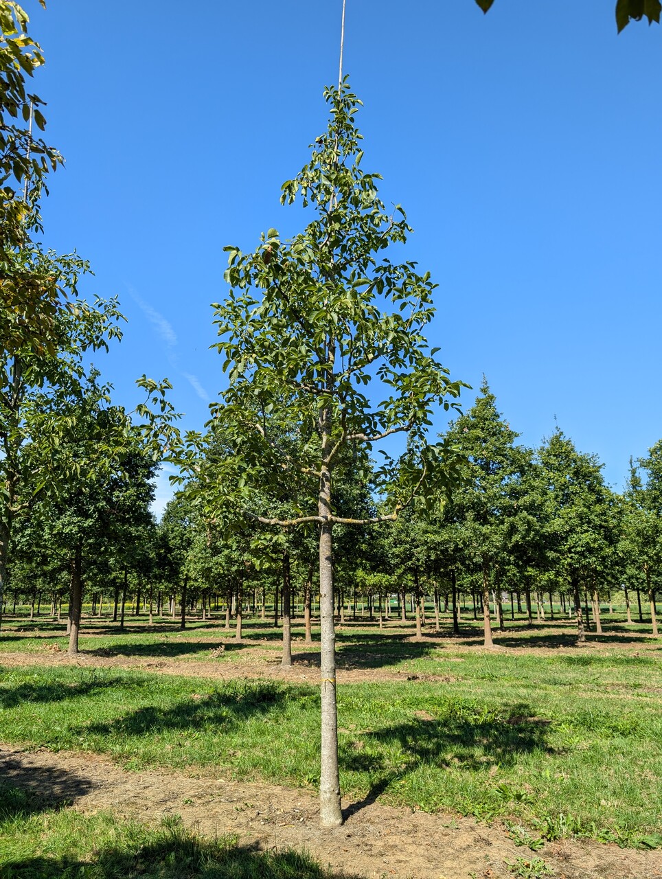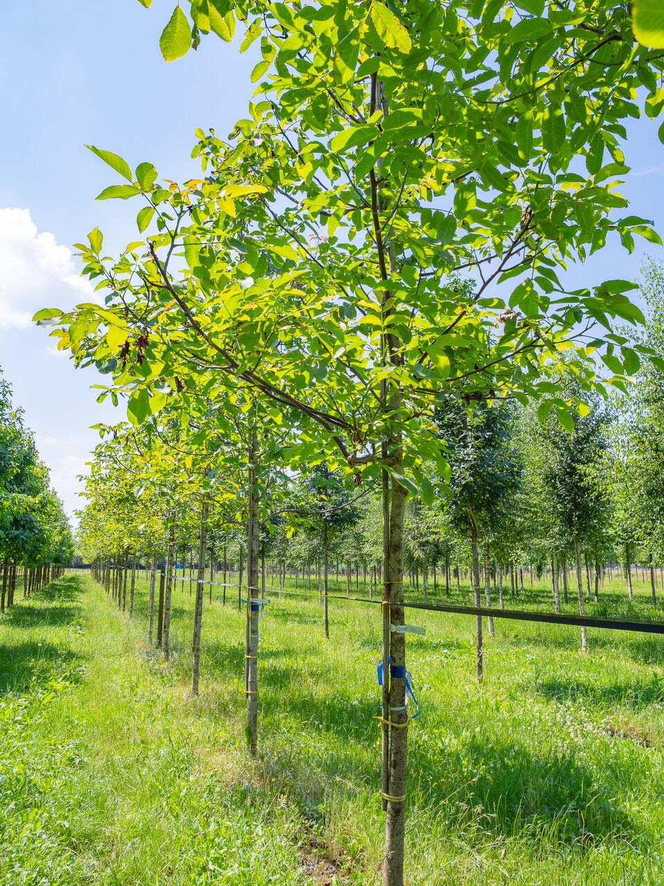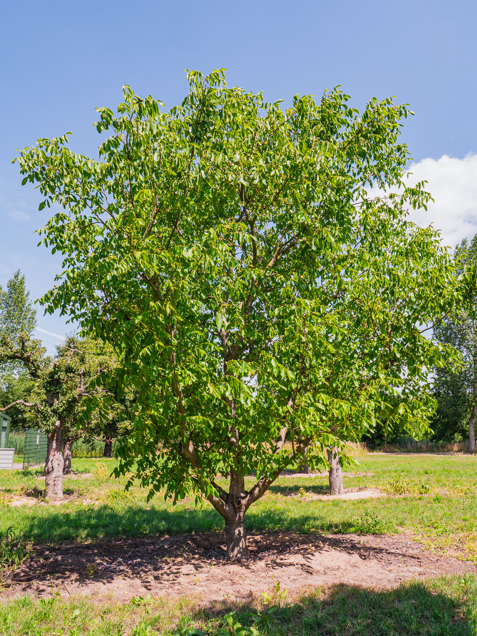 Has been cultivated for many centuries and grows to become a large tree approx. 30 m tall. The almost round crown consists of heavy branches. The old trunk is light grey with deep, irregular vertical grooves. The imparipinnate leaves grow to a length of 20 - 30 cm and have 2 - 4 (6) opposing pairs of leaflets. The leaf segments are ovoid to oval, approx. 8 - 12 cm. After the appearance of the leaves the large male catkins (approx. 7 cm) and the smaller female flowers appear, the latter in groups of 2 or 3. The green, almost round fruit has a smooth husk that has short gland-like hairs at the beginning. The light brown nut is grooved. Very tasty. The nuts do not appear until the tree is approx. 15 years old. Has deep roots and much prefers open soil that the roots can penetrate. The tree is an important producer of wood.