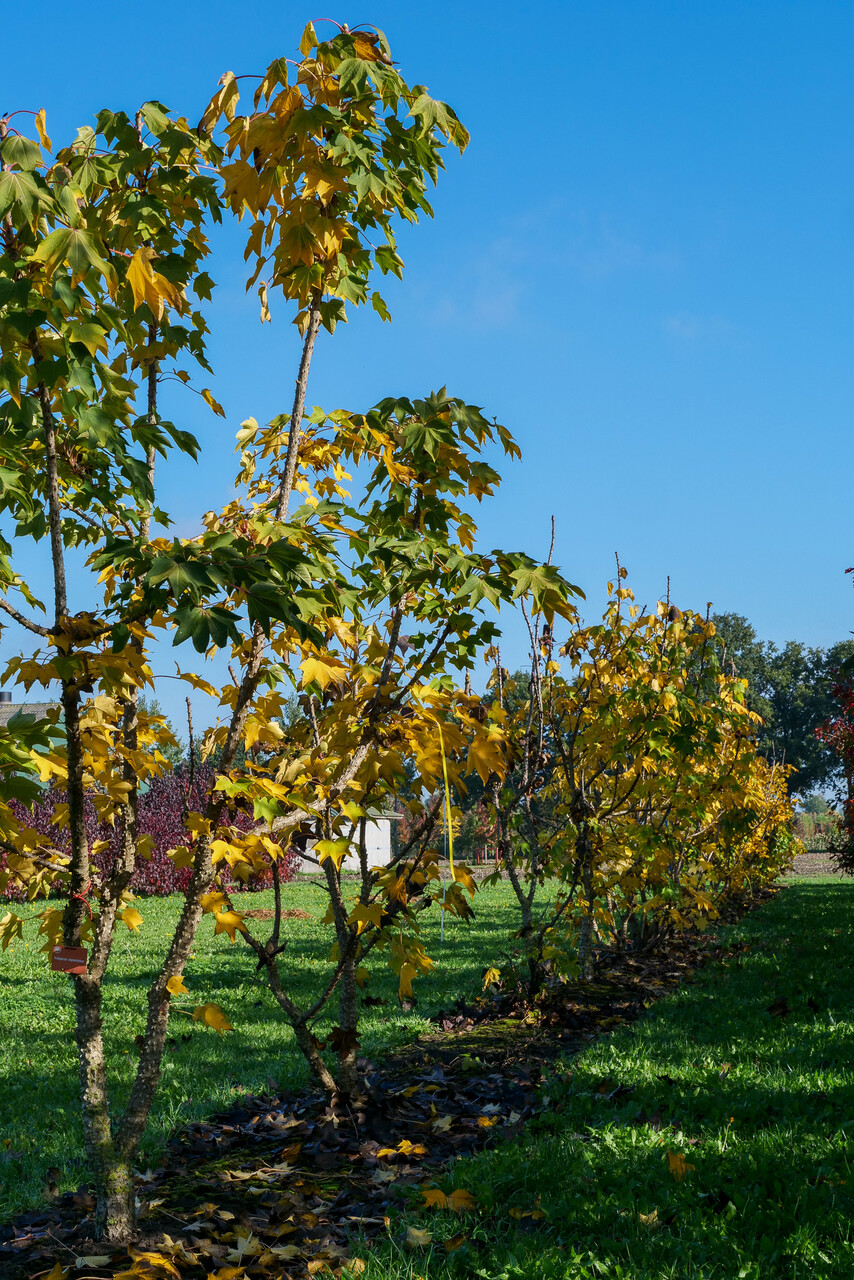 Kalopanax septemlobus is a very distinctive tree, somewhat similar to Aralia, of which it is related. Yet the tree clearly differs from it in several respects. K. septemlobus grows distinctly upright and reaches 10 to 15 m in height. In exceptional cases, the tree can grow more than 20 m tall. The thick twigs are covered with sharp spines. On the older bark, these disappear after which the bark becomes grooved. The large leaves are mainly at the tips of the twigs. They are palmately lobed with the lobes varying in depth. The leaves unfurl quite light green and are a glossy dark green in summer. In autumn, it turns deep yellow to yellow-brown before falling off. In late summer, the broad, umbel-shaped panicles of small white flowers appear. The individual flowers are arranged in globular bundles, which together form the panicles. The panicles are about 30 cm long and wide and are crowded by bees. After flowering, the small blue-black berries appear, which are also ornamental.