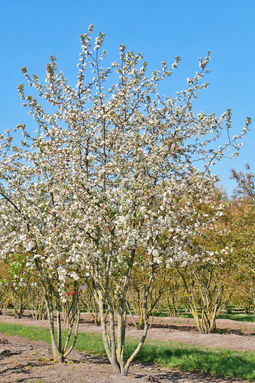 Small tree with a pyramidal crown that later broadens out. The branches spread wide, becoming somewhat pendulous later. The twigs and bark are hairless and dark brown. The slightly lobed and dark green leaves remain in the tree for a long time in the autumn, turning to yellowish-orange. The flowers, almost 6 cm in size, grow in bundles of 4 to 8 together. In the bud the flowers are dark purplish-pink but they turn bright white when open. 'Evereste' produces abundant orange-red to red fruits with a diameter of up to 2.5 cm that remain hanging in the tree until far into the winter. Can be used in gardens, parks and public gardens, but only in verges as a street tree. The tree grows best in nutritious, not too dry soil. Free of mildew and scab. Allowing a solitary planted shrub to grow into a multi-trunked tree can produce an attractive effect.