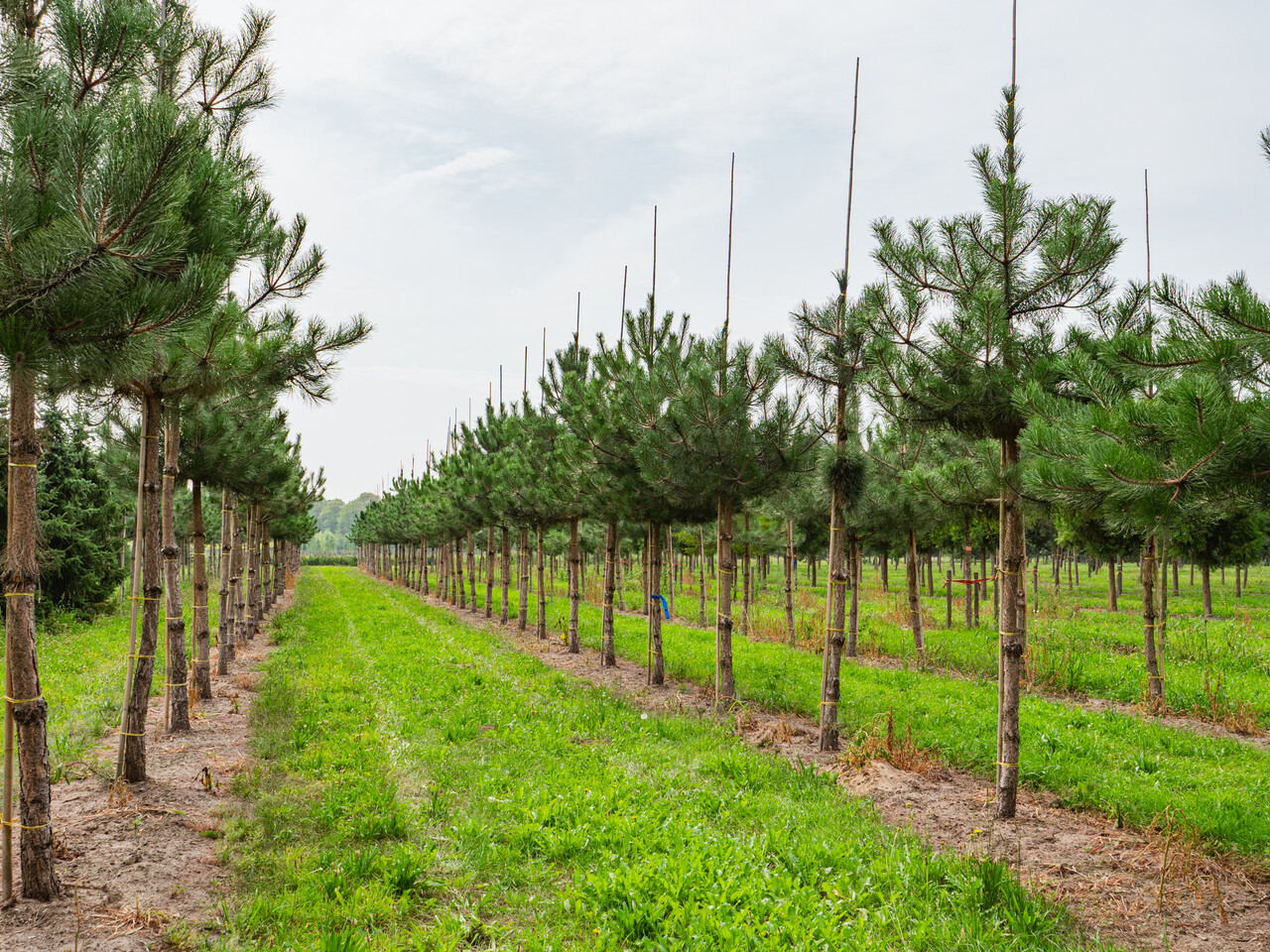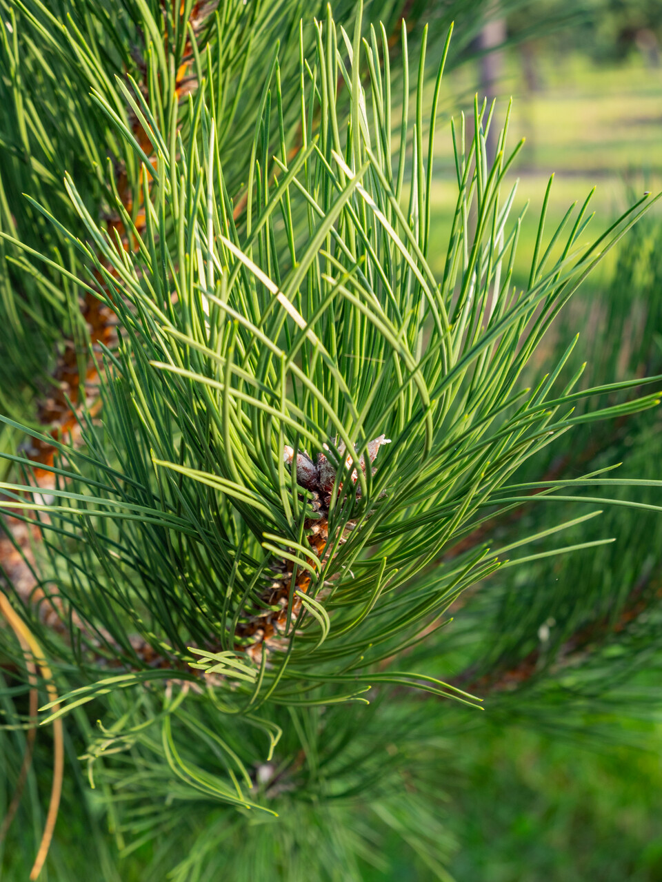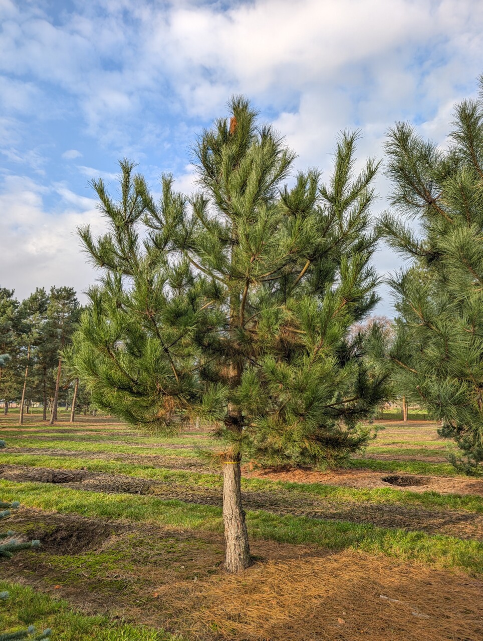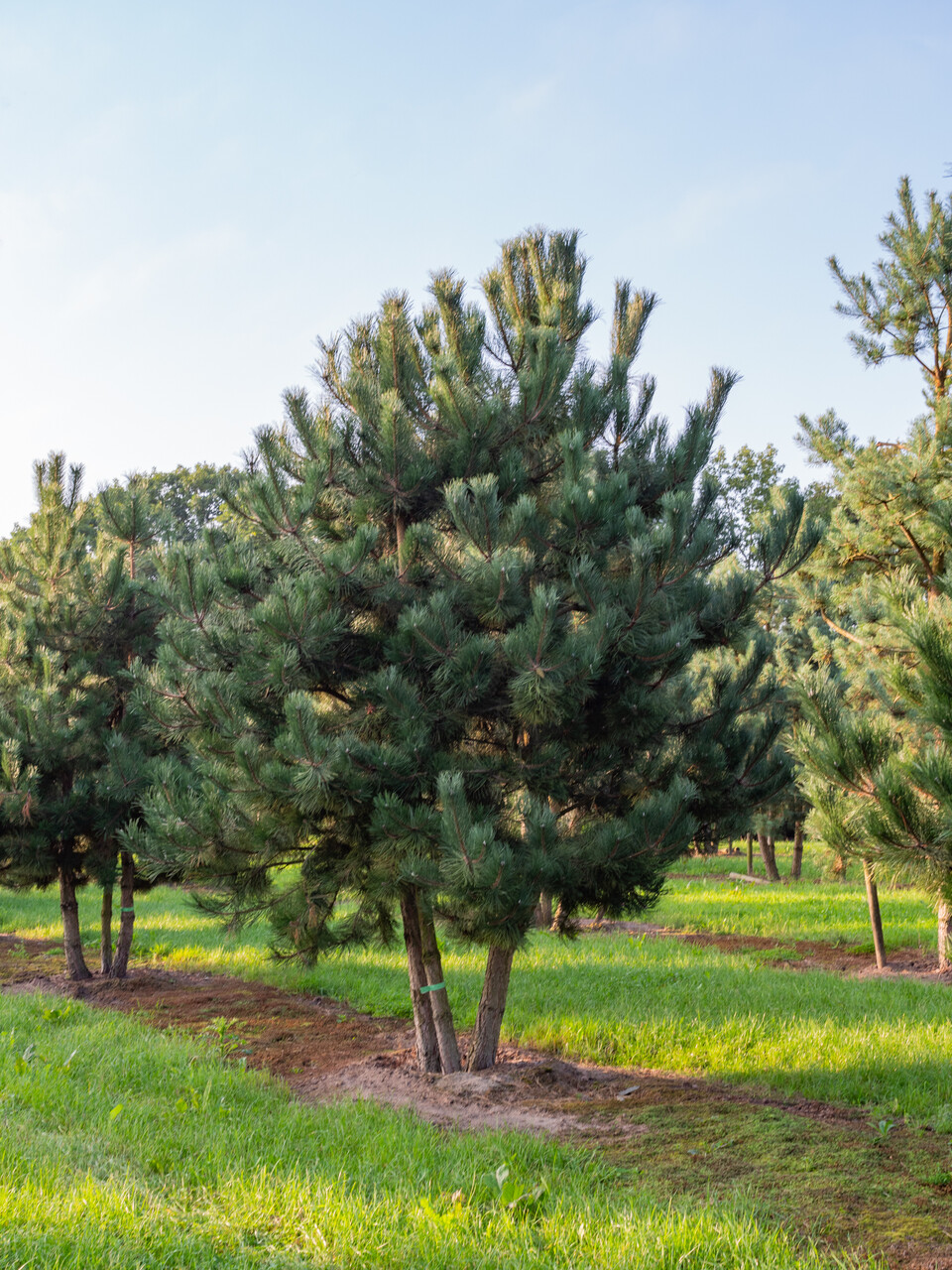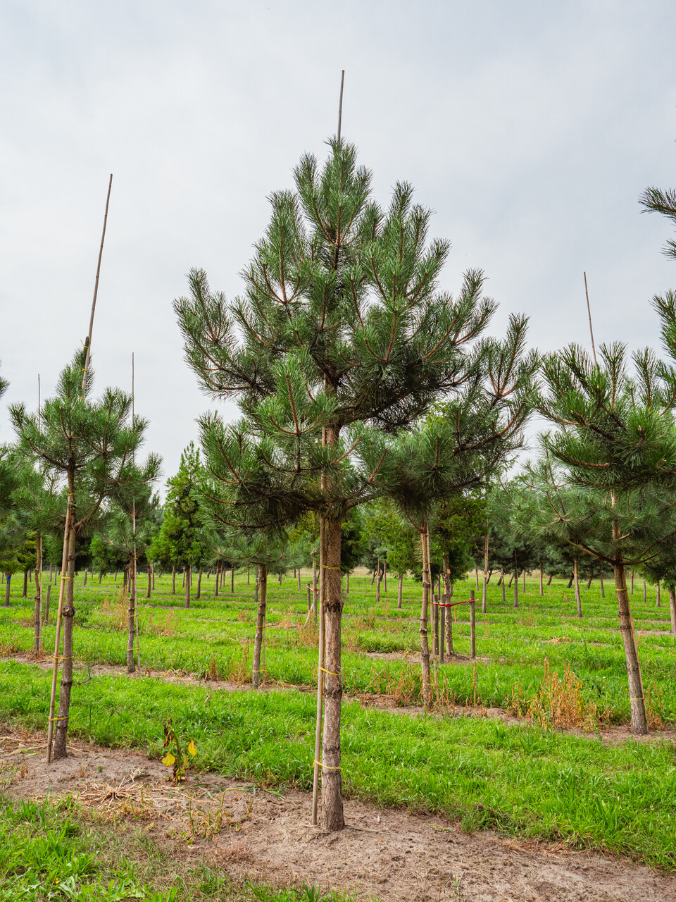 Produces a very large, impressive tree with striking bark. Can be used as a low, branched tree or pruned to have a crown. When growing freely on its own, the branches are full down to the base. In its youth, the tree still grows pyramidally, but when mature it becomes broader, corymbose, to round. The blackish grey bark has deep grooves and is particularly decorative, especially in mature trees. Branches are bare and yellowish brown. The needles grow in bundles of 2 together and are a striking dark green, stiff and somewhat pointy. The almost symmetrical cones are light brown and usually hang in pairs or singly. Empty cones fall off in the spring. Suitable for many types of soil. Even grows in dry, calcareous soil. Tolerates shaping well, so this tree can be used in smaller spaces as well. Resistant to sea wind and highly resistant to air pollution.
