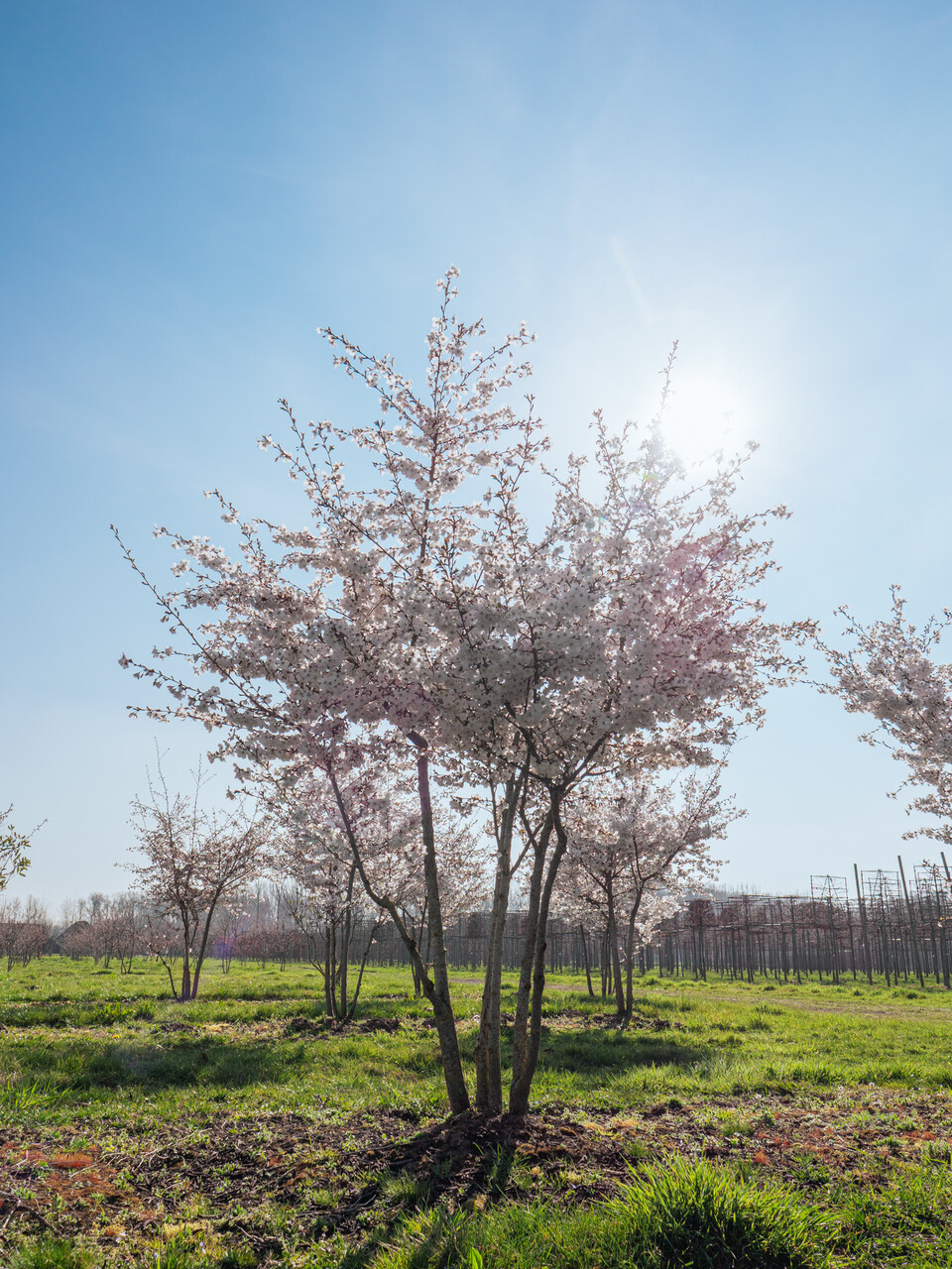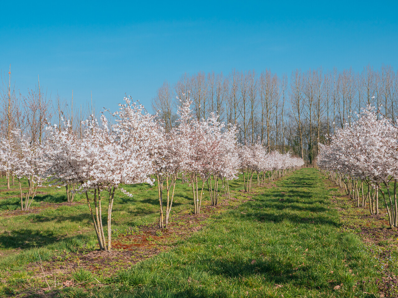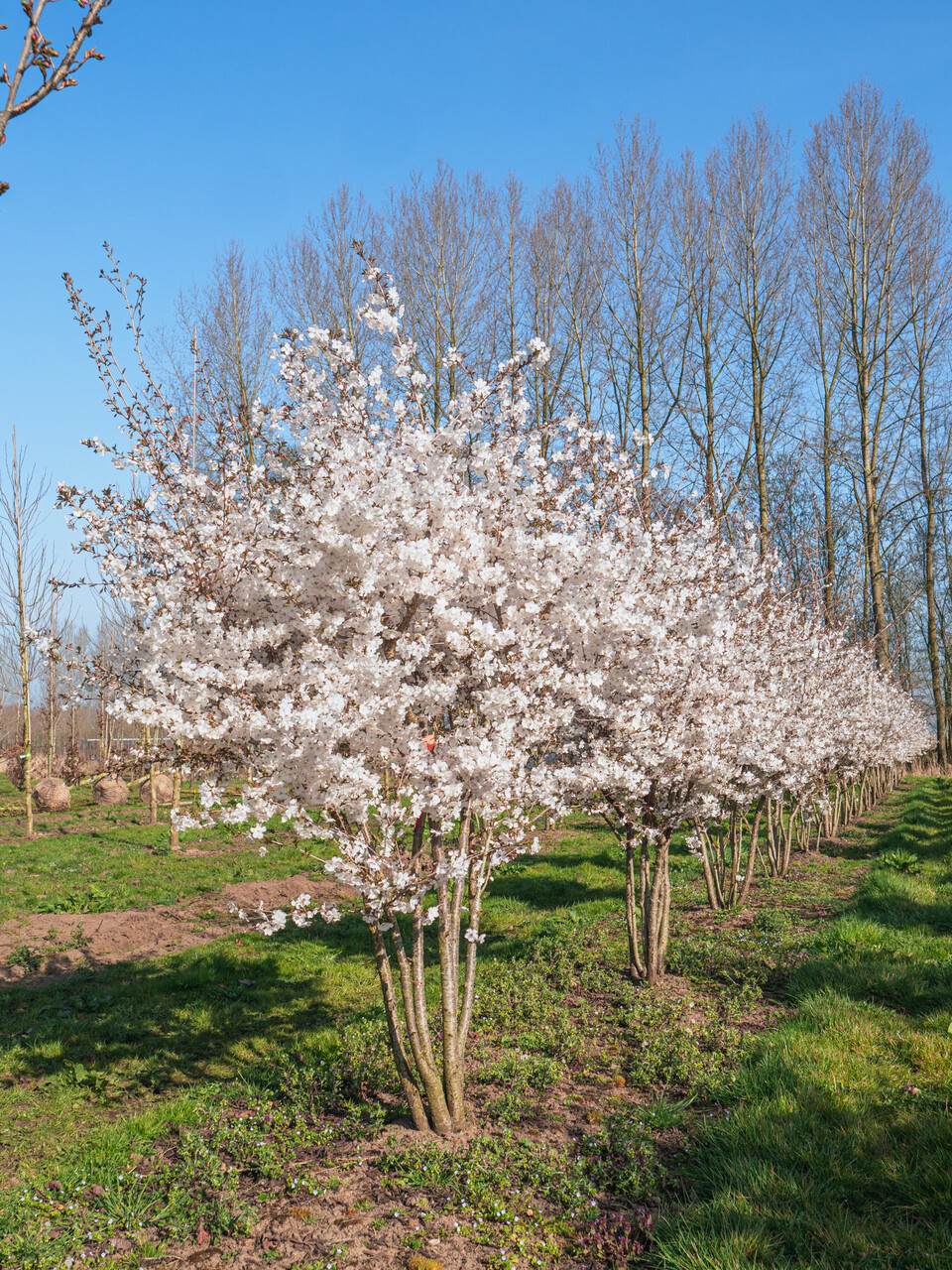 Small to medium-size tree, initially with quite narrow crown, but quickly broad vase-shaped. Later the branches overhang somewhat which may create a flat-topped, spherical crown. The leaf is narrow ovate to elongated and has a long pointed tip. It emerges as bronze-green and turns fresh green in summer. In autumn it displays various colours; orange, red and purple before falling. The flower buds are pink. Before the leaf emerges the tree blossoms very abundantly with large, single, white flowers with striking pink stamens. They may be followed by dark red, round to slightly oval fruits. ‘The Bride’ was found as a seedling of P. ‘Pandora’ by Harry van Trier. A good alternative to P. x yedoensis, which grows significantly larger. Does not tolerate permanently high water table.