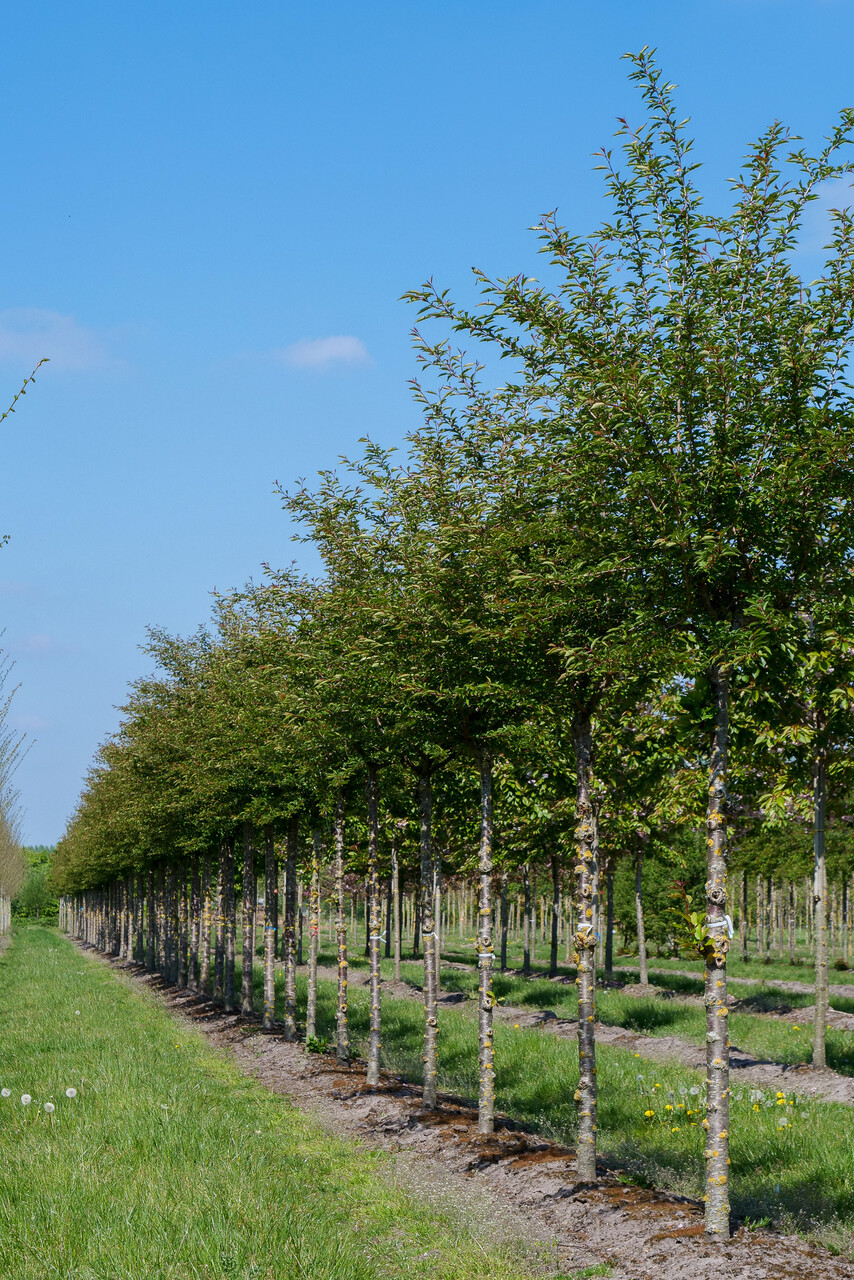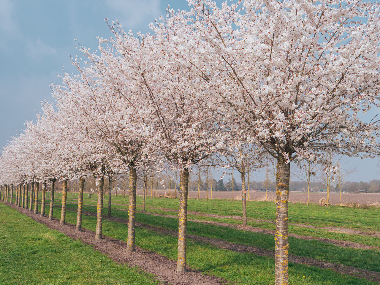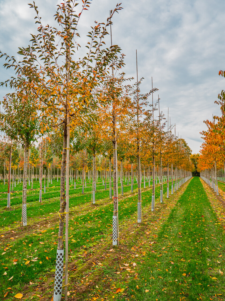 Small to medium-size tree, initially with quite narrow crown, but quickly broad vase-shaped. Later the branches overhang somewhat which may create a flat-topped, spherical crown. The leaf is narrow ovate to elongated and has a long pointed tip. It emerges as bronze-green and turns fresh green in summer. In autumn it displays various colours; orange, red and purple before falling. The flower buds are pink. Before the leaf emerges the tree blossoms very abundantly with large, single, white flowers with striking pink stamens. They may be followed by dark red, round to slightly oval fruits. ‘The Bride’ was found as a seedling of P. ‘Pandora’ by Harry van Trier. A good alternative to P. x yedoensis, which grows significantly larger. Does not tolerate permanently high water table.
