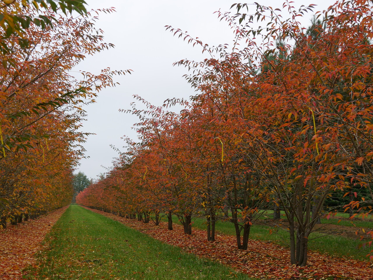 Listy stromu Prunus 'The Bride' sa na jeseň sfarbia do oranžová, červená, fialová."