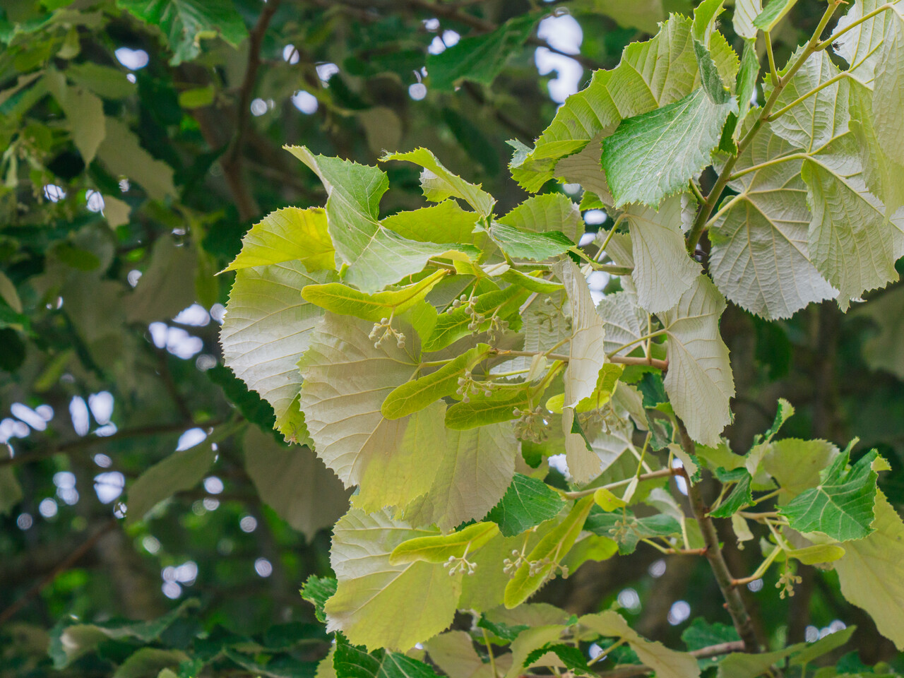 Listy stromu Tilia tomentosa 'Brabant' sa na jeseň sfarbia do žltá."