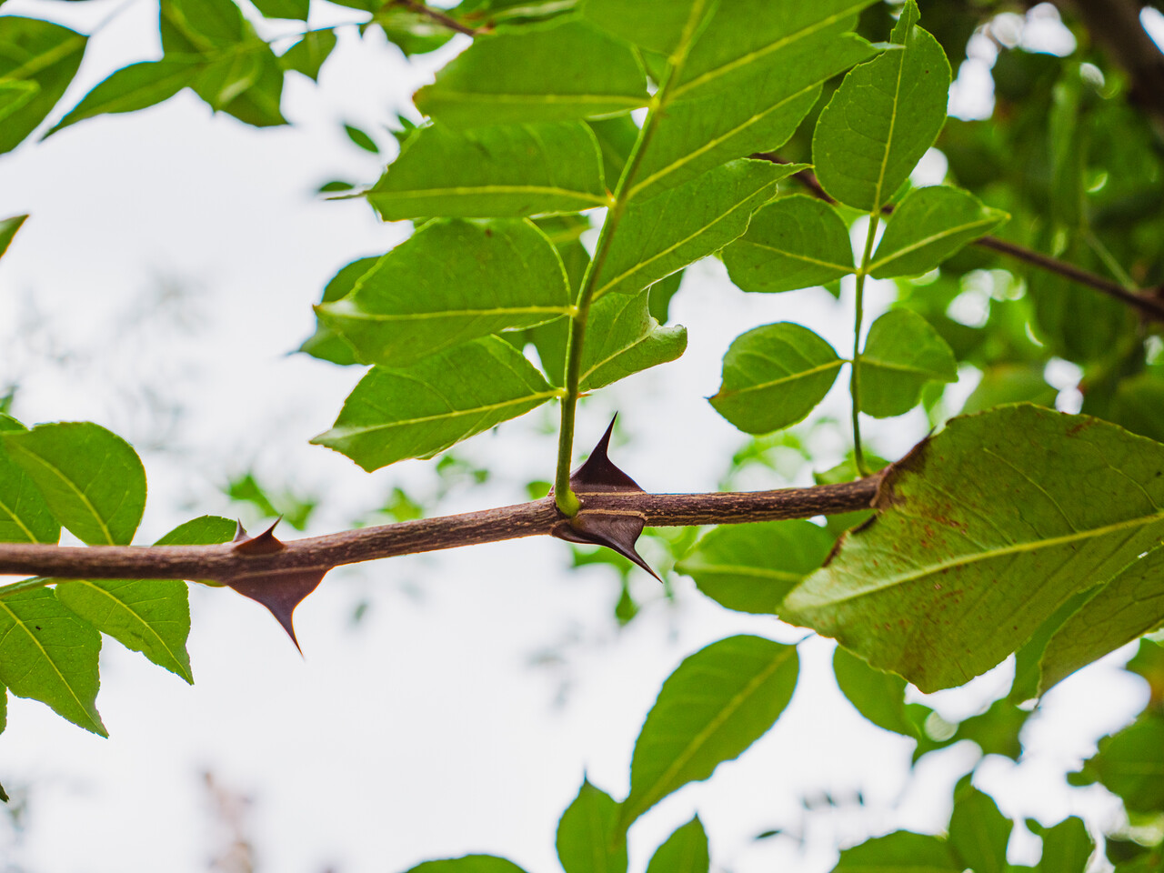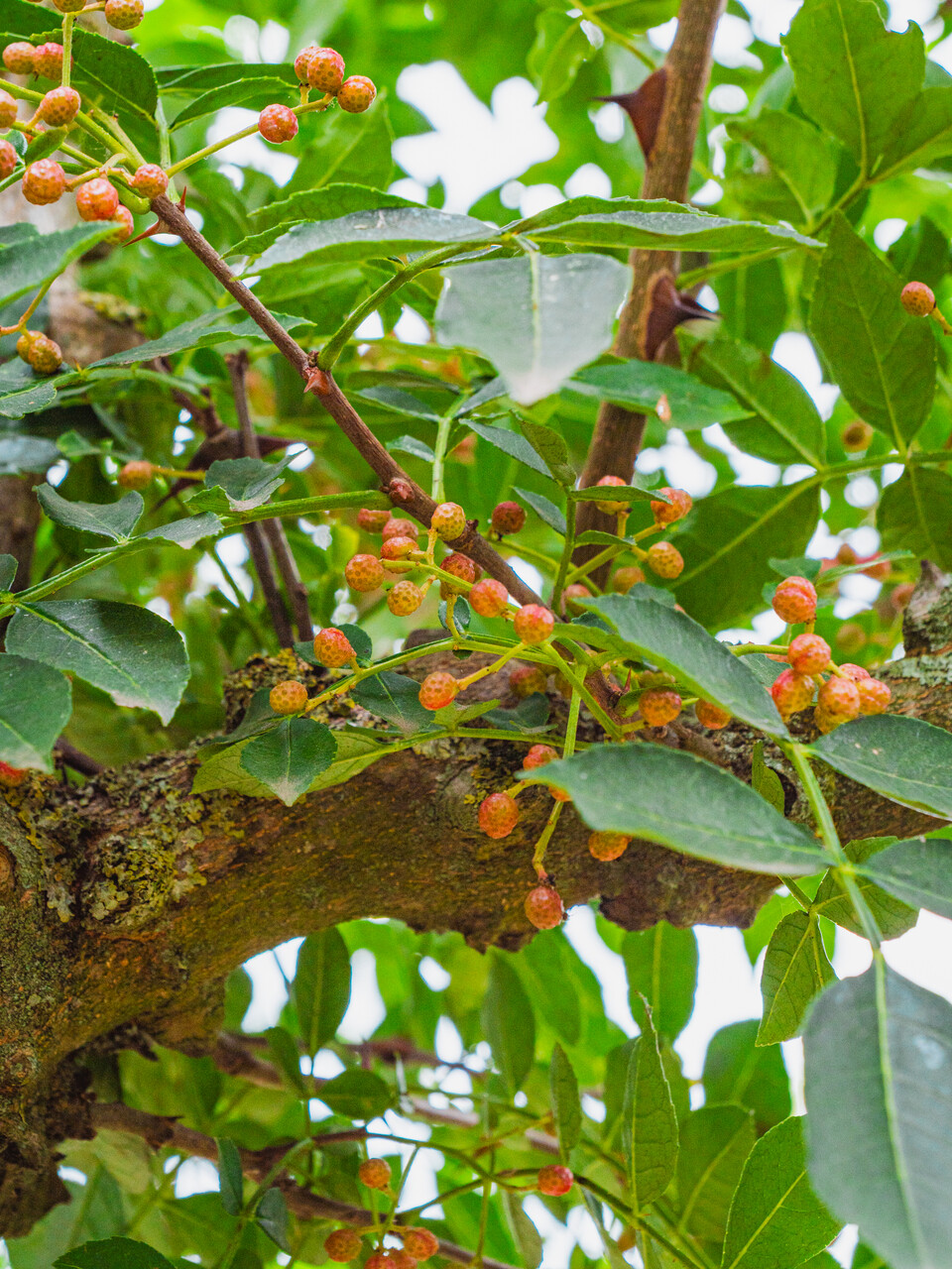Listy stromu Zanthoxylum simulans sa na jeseň sfarbia do žltá, oranžová."