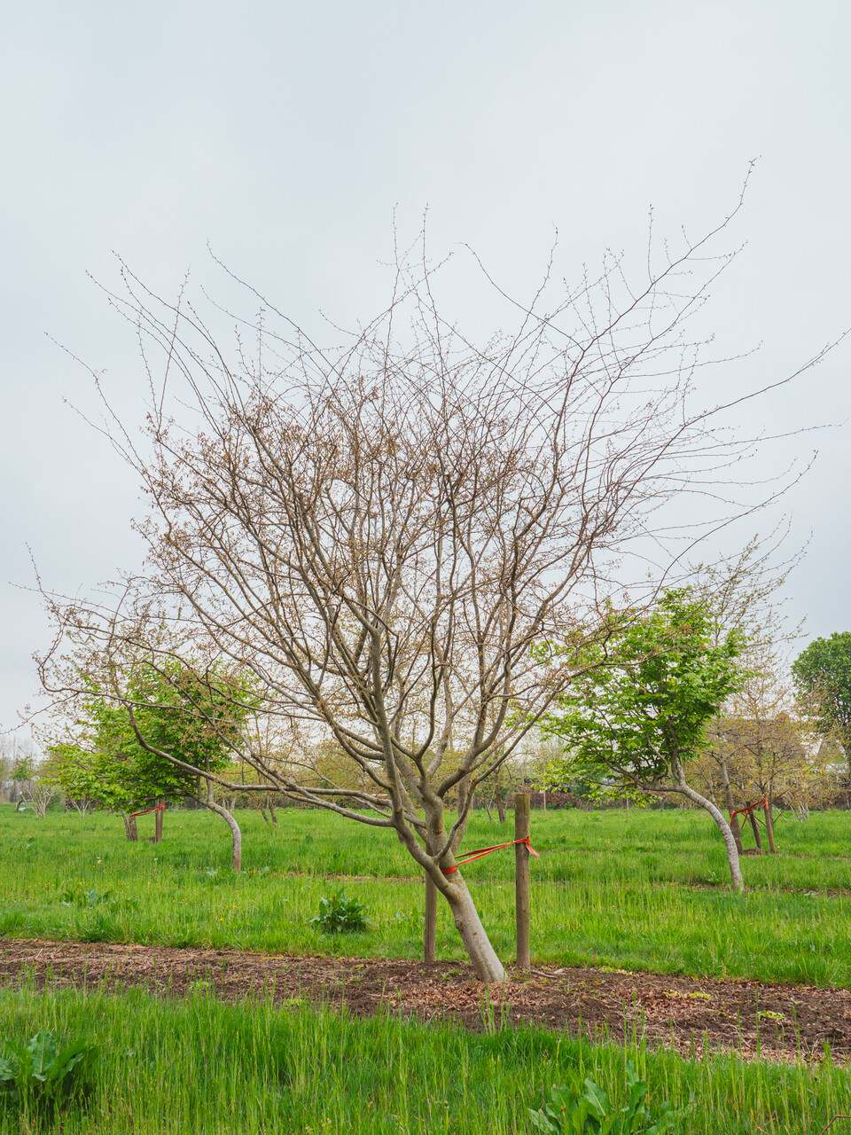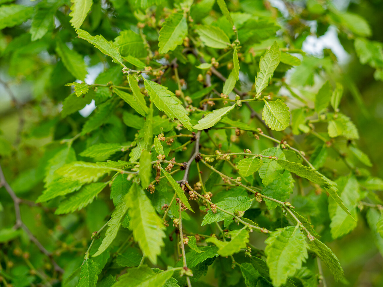 Zelkova carpinifolia 'Verschaffeltii' kvitne v apríl.